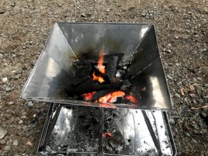 準備が一段落したら椅子をセットして、焚き火台の炭が料理できる火力になるまで全集中。