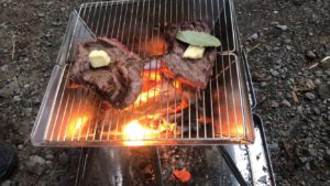キャンプ飯はお米とステーキとソーセージ、野菜も炒めて、最後は新聞紙とアルミホイルに包んだ焼き芋。