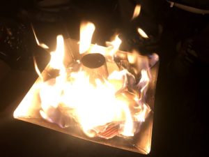 陽が沈んで炎の眺めながらキャンプ気分を味わいます。