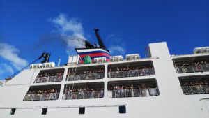 太鼓で見送られ行きと同様にドラの音がなり、島の人たちに見送られて船は出航しました。