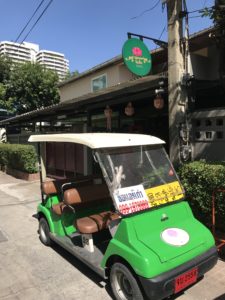 店舗の前に停車している緑色のカートで大通りまで送迎してくれます。
